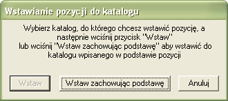 Mogę teraz wrócić do kosztorysu i z menu Pozycja lub menu podręcznego wybrać hasło Wstaw do katalogu, które wywoła spis katalogów i włączy okno Wstawianie pozycji do katalogu.