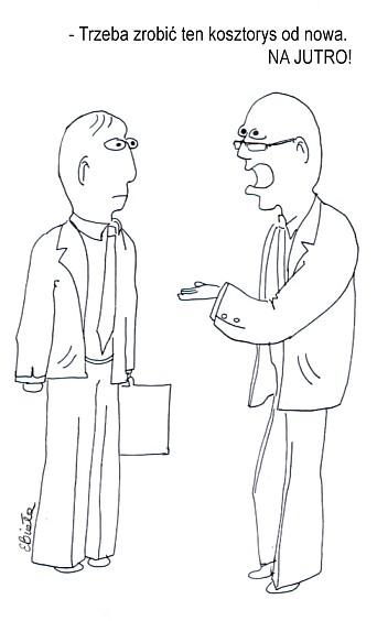 Innymi ciekawymi przypadkami, z którymi my, kosztorysanci mamy do czynienia, to również sytuacje, gdy robota jest już wykonana, a my mamy sporządzić kosztorys ofertowy. Tak, tak – nie pomyliłem się - ofertowy, a nie powykonawczy. Bowiem najpierw wykonano pracę, przyjmując kwotę taką, by wszyscy zainteresowani byli z niej zadowoleni, a dopiero po wykonaniu inwestycji trzeba stworzyć podkładkę dla zlecającego roboty, tak na wszelki wypadek, gdyby komuś przyszło do głowy skontrolować papiery. Jak pokazuje życie, kosztorysy takie są najczęściej zawyżone w stosunku do rzeczywiście ponoszonych kosztów. Wielu oburzy się w tym momencie - tak nie powinno być, zwłaszcza gdy mamy do czynienia ze środkami publicznymi. Teoria swoje, a życie swoje – niestety.