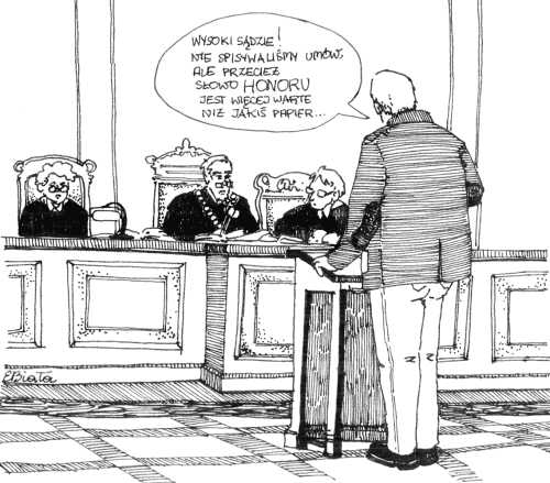 Odpowiedziałem, że od 10 lat już nie jestem biegłym sądowym, kiedy to po ukończeniu 70-tej wiosny życia otrzymałem miły list od pani prezes sądu informujący, że minister sprawiedliwości w swoim rozporządzeniu nie toleruje w sądach takich starych jak ja dziadów, w związku z czym odwołując mnie, życzy mi zdrowia i długich lat życia. Oczywiście mogę, napisawszy stosowne podanie, ubiegać się o przedłużenie pełnienia tej funkcji.