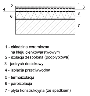 - poz. 2 i 3 – spadek powinien być wykonany bezpośrednio na płycie konstrukcyjnej; do wykonania warstwy spadkowej stosować można (zawsze po uprzednim wykonaniu warstwy sczepnej) zaprawy PCC, specjalne suche zaprawy zarabiane wodą oraz tradycyjne zaprawy; te ostatnie muszą mieć grubość przynajmniej 3 cm w najcieńszym miejscu,