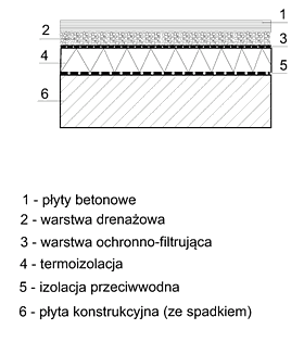 Przykładowy układ warstw tarasu w układzie odwróconym nad pomieszczeniem ogrzewanym z drenażowym odprowadzeniem wody
