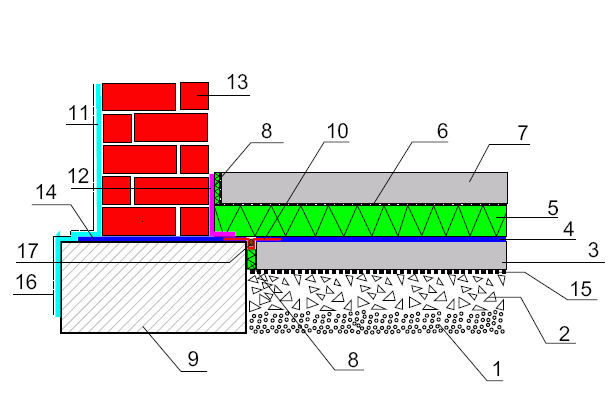 Uwaga: Materiały hydroizolacyjne należy dobierać tak, aby nie wystąpiła konieczność nakładania materiału mineralnego na bitumiczny. W zależności od obciążeń, stosowanych materiałów i wytycznych producenta może dodatkowo zaistnieć konieczność gruntowania podłoża lub stosowania wkładek ochronno-wzmacniających. Gdy izolacja (14) wykonana jest z papy, w celu połączenia jej z izolacjami (podposadzkową oraz pionową) konieczne są dodatkowe zabiegi.