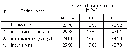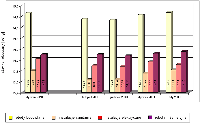 Od stycznia 2010 do stycznia 2011 roku stawki robocizny zmalały przy robotach budowlanych o 0,3%, instalacjach sanitarnych i elektrycznych o 0,4%, a przy robotach inżynieryjnych wzrosły o 0,1%.