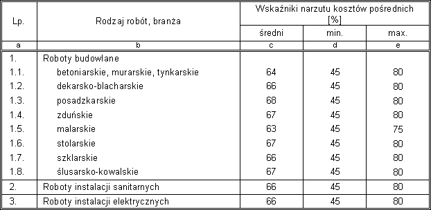 W tablicy 5 ukazano z kolei wartości robocizny brutto, tj. obejmujące stawkę kosztorysową wraz z odniesionymi do niej narzutami (kosztów pośrednich i zysku).