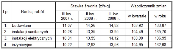 Z prowadzonych badań i analiz wynika, że stawki robocizny w III kwartale 2008 uległy dalszemu wzrostowi. W zależności od branży robót wzrosły one od 4 do 5%.