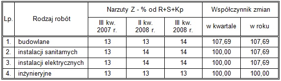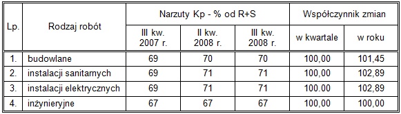Poniżej przedstawiam stawki robocizny i narzuty z III kwartału 2008, konfrontując je równocześnie z odpowiednimi wartościami z III kwartału 2007 i II kwartału 2008. W dwóch ostatnich kolumnach ukazuję stosowne współczynniki zmian.