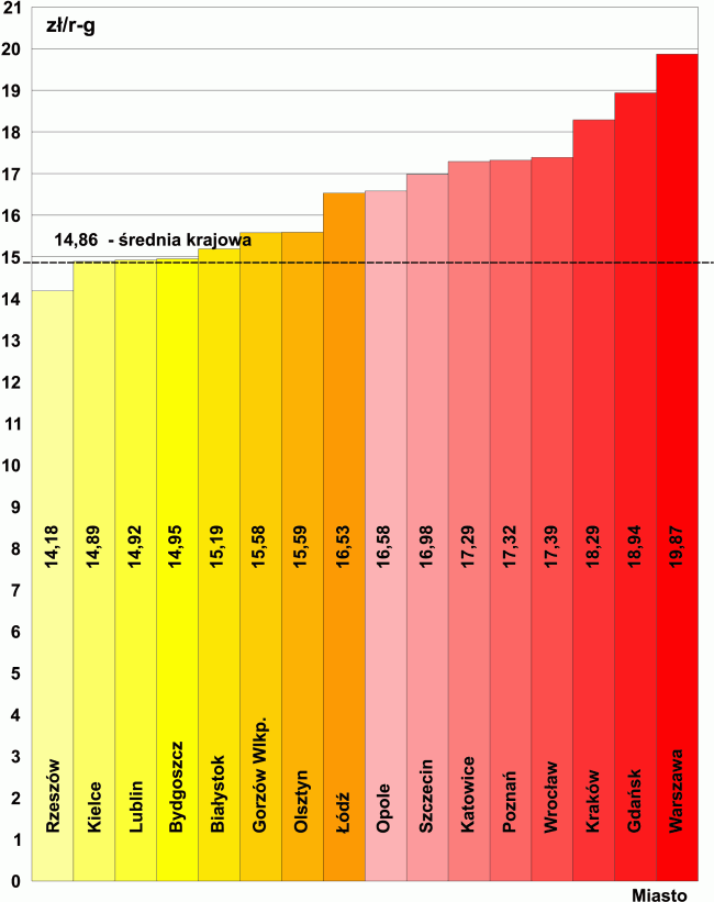 W uzupełnieniu regionalnych informacji o kosztorysowych stawkach robocizny i narzutach, w rozdziale tym przedstawiono dane z wybranych większych miast. Dopełnieniem obrazu jest wykres kosztorysowych stawek robocizny dla robót budowlanych w poszczególnych miastach na tle średniej stawki krajowej.