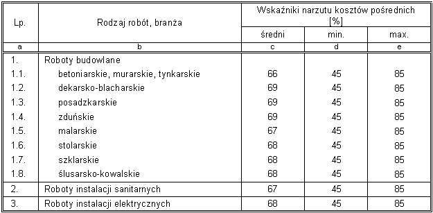 Wskaźniki narzutów w większości zmniejszyły się o jeden punkt procentowy. Dotyczy to wszystkich narzutów przy instalacjach i wskaźnika zysku przy robotach budowlanych. Natomiast wskaźnik narzutu kosztów pośrednich przy robotach budowlanych zmniejszył się o dwa punkty procentowe, a wskaźnik narzutu kosztów zakupu przy tych robotach nie zmienił się.
