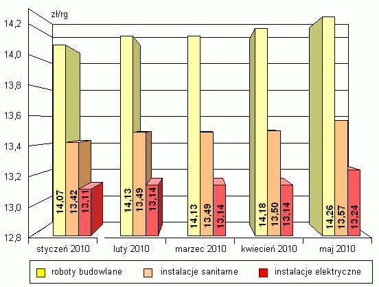 W porównaniu z poprzednim kwartałem stawki robocizny brutto zmniejszyły się przy robotach budowlanych o 2,0%, przy instalacjach sanitarnych o 1,3%, a przy instalacjach elektrycznych o 1,0%.