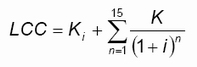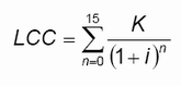 Suma tych kosztów od 1,2...n w poszczególnych latach eksploatacji stanowi zdyskontowany koszt energii elektrycznej. Dyskontowaniu podlegają wszystkie koszty ponoszone w cyklu życia urządzenia. LCC wyznaczono w następujący sposób: