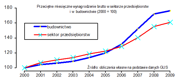 Płace w budownictwie były do 2005 r. niższe od płac w sektorze przedsiębiorstw i w wielu dziedzinach gospodarki. Od 2005 r. płace w budownictwie wzrastały dynamicznie. W sierpniu 2006 r. poziom płac w budownictwie i w sektorze przedsiębiorstw zrównał się i od tego czasu jest wyższy. Przyczyną była presja na płace w związku z rosnącymi zadaniami budownictwa przy trudnościach z pozyskaniem pracowników m.in. na skutek emigracji zarobkowej. Kryzys na rynkach finansowych wpłynął na zahamowanie wzrostu płac w 2009 r., jednak nadal płace w budownictwie wzrastają, chociaż nie tak dynamicznie jak poprzednio.