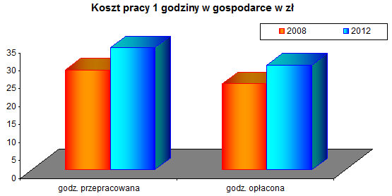Przeciętny miesięczny koszt pracy w gospodarce narodowej na 1 zatrudnionego wynosił w 2008 r. 3966,5 zł, a w 2012 r. 4758,6 zł. W czasie 4 lat wzrósł o 19,4%. Koszt pracy na 1 godzinę zarówno opłaconą jak też przepracowaną wzrósł o 22%.