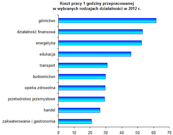 Rodzaj działalności prowadzonej przez jednostkę jest podstawowym kryterium różnicującym poziom kosztów pracy. Porównanie kosztów pracy według tego kryterium wskazuje, że w 2012 r. najwyższe koszty pracy odnotowano w górnictwie i wydobywaniu (głównie w górnictwie rud metali nieżelaznych), a najniższe w zakwaterowaniu i w usługach gastronomicznych. Należy też zwrócić uwagę, że czas pracy był wykorzystywany lepiej w jednostkach prowadzących działalność usługową i gastronomiczną (wykorzystywano 87% czasu opłacanego), niż w górnictwie i wydobywaniu (wykorzystywano 82% czasu opłacanego).