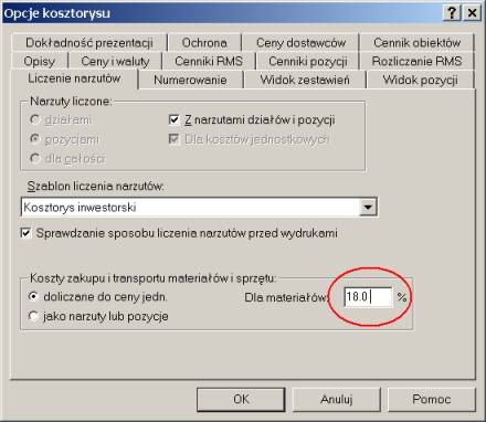 Jest to najprostszy przypadek. Jedyne, co musimy zrobić (w kwestii doliczania kosztów zakupu), to po uruchomieniu programu i wybraniu rodzaju kosztorysu kosztorys inwestorski wejść w opcje kosztorysu i podać wysokość narzutu kosztów zakupu.
