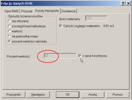 Rys.2. Okno określania procentu wartości ceny materiału na koszty narzutu