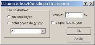 - jeżeli uznaliśmy, że dla materiałów grupy xyz należy stosować oba narzuty, to musimy wywołać okno przedstawione na rys. 3. i w pole Stawka wpisać wartość sumaryczną