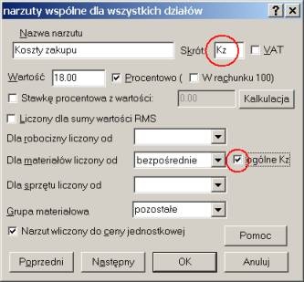 Zanim dokonamy właściwej operacji musimy sprawdzić, czy narzut koszty zakupu jest prawidłowo określony. Chodzi o to, że program nie jest w stanie domyślić się, który narzut ma określać koszty zakupu. Ktoś mógłby bowiem użyć nazwy "transport" lub "przewóz materiałów" lub jeszcze inaczej. Dlatego przyjęto zasadę, że rodzaj narzutu jest rozpoznawany przez równoczesne spełnienie dwóch warunków :