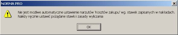 Pojawi się on wówczas, gdy program nie będzie potrafił samodzielnie ustawić właściwych narzutów. Najczęściej taka sytuacja ma miejsce wówczas, gdy dla któregoś (lub kilku) materiałów wartość kosztów zakupu została ustawiona indywidualnie. Oczywiste jest, że program nie może zdefiniować narzutu, który będzie dotyczył jedynie wybranych materiałów, jeżeli nie zostały one połączone w grupę. Dlatego użytkownik musi dokonać działań samodzielnych.