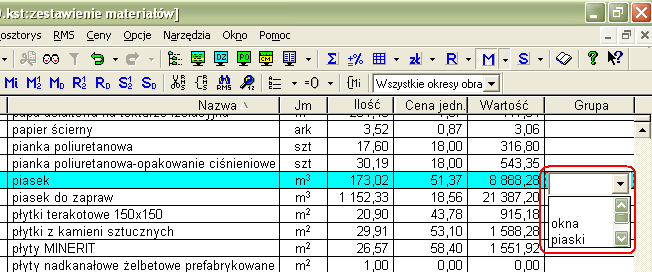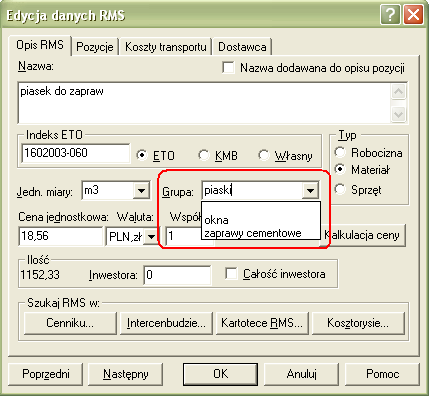 Aby takie rozróżnienie zastosować należało utworzyć grupę materiałową „Materiały masowe” i przypisać do niej wszystkie piaski występujące w kosztorysie. Aby tego dokonać wywołuje się z poziomu widoku zestawienie materiałów dialog Edycja danych RMS klikając dwukrotnie w rubryce Lp. przy materiale „piasek” i następnie rozwinięcie listy obok hasła Grupa. Jeżeli na tej liście nie występuje nazwa piaski, to musimy je dopisać i zatwierdzić przyciskiem OK.