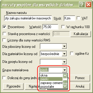 Narzut ten musimy przyporządkować do grupy materiałowej piaski. Drugi narzut Koszty zakupu musimy w tej sytuacji przyporządkować do grupy Pozostałe.