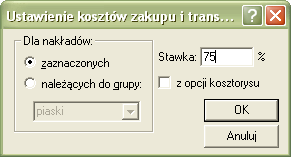 Gdy z menu podręcznego (prawy przycisk myszy) w zestawieniu materiałów wybierzemy hasło Stawka kosztów transportu, to pojawi się dialog: