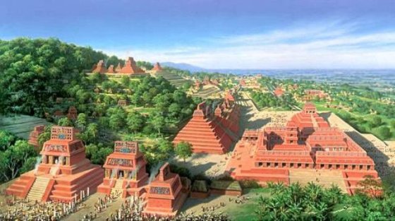 Rysunek przedstawiający artystyczne wyobrażenie jak wyglądały miasta cywilizacji Majów w czasach świetności Autor nieznany. Źródło: Getty Images