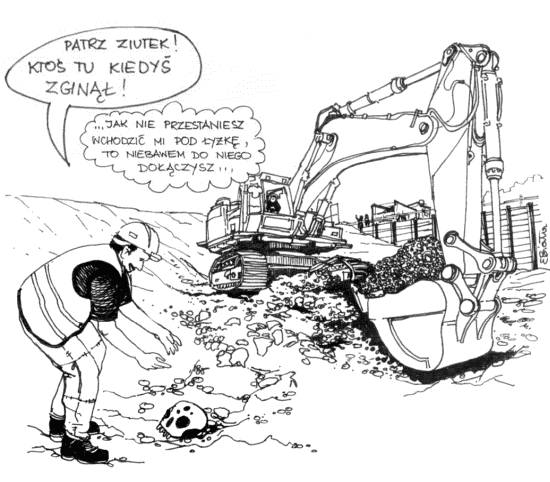 Za oknem widzę „wielką dziurę” w ziemi. Z jednej strony oszalowaną szczelnie wbitymi w ziemię dwuteownikami, pomiędzy którymi prężą się drewniane bale, z drugiej skarpa, a na niej koparka z olbrzymią łyżką. Pod nią, niczym pszczoła, uwija się pracownik. W żółtej kamizelce, podobnym kasku i czarnej przeciwdeszczowej kurtce. Coś sprawdza, schyla się podnosząc od czasu do czasu jakieś kawałki i elementy starej konstrukcji. Daje znaki operatorowi. A łyżka niezmiennie precyzyjnie wyrywa kawałki gruntu i niespiesznie przenosi je na stojący obok samochód z kiprem. Pewność, z jaką ów robotnik porusza się tuż obok łyżki oraz płynność i precyzja ruchów ramienia koparki, jaką prezentuje operator wskazuje, że ta para prawdopodobnie już nieraz pracowała w ten sposób. I, mimo że przebywanie pracownika w zasięgu „działania naczynia roboczego maszyny roboczej” jest w zasadzie niedopuszczalne, to jednak zdarza się często. Ludzie mają to do siebie, że „ułatwiają” sobie pracę kosztem zagrożenia dla swojego zdrowia, a nawet życia. I trwa to zazwyczaj dopóty, dopóki nie staną się ofiarą wypadku lub jego bezpośrednim świadkiem. Ciężko jest bowiem przezwyciężyć nawyki ewolucyjne mózgu, który analizując „oswojone” otoczenie stosuje schematy i naturalnie dąży do zmniejszania obciążeń percepcyjnych, a przy stale występujących bodźcach może nawet je ignorować. Podobnie jak po pewnym czasie przestajemy zauważać, że coś w pomieszczeniu nieładnie pachnie, czy ignorujemy permanentny hałas uliczny za oknem, tak z czasem przyzwyczajamy się do istnienia zagrożenia ze strony maszyn i urządzeń, zaczynamy je traktować jako naturalny element „naszego środowiska” i ewentualne sygnały zagrożenia z ich strony nasz układ percepcji, co prawda, dostrzega, ale je ignoruje, a niestety bardzo ciężko jest chronić się przed tym ukształtowanym w toku ewolucji naszego gatunku zwyczajem naszego mózgu, a więc przed popadaniem w zgubną rutynę. Możemy wprowadzić do używania urządzenia i maszyny, które nie będą stanowiły niebezpieczeństwa dla pracownika lub też poddać mózg pracownika skutecznemu „praniu”, tak by nasączyć go dobrymi, chroniącymi przed niebezpieczeństwem na stanowisku pracy procedurami, wyrobić w nim nawyk podobny do tego, jaki ma zawodowy kierowca. W pierwszym przypadku niestety praca na budowie nie pozwala na konstrukcyjno-projektowe szaleństwa. Skuteczne osłony można stosować praktycznie jedynie przy sprzęcie pomocniczym i w narzędziach ręcznych. Dużych maszyn budowlanych niestety nie da się zamknąć osłonami, no może poza wydzieleniem stref ochronnych, ale te nie będą działać automatycznie - ich skuteczność będzie proporcjonalna do przywiązania robotników do przyjętych na budowie procedur i efektywności działania pracowników nadzoru. Dobre procedury organizacyjne są istotne zwłaszcza dla operatorów maszyn – ich błędy bowiem mogą prowadzić do groźnych wypadków, także z udziałem wielu pracowników jak i osób postronnych. Dlatego ustawodawca w niektórych przypadkach wymaga od osób kierujących lub operujących sprzętem budowlanym nie tylko przejścia samego szkolenia, ale także zdania egzaminu, który potwierdzi, że operator w trakcie pracy będzie świadomy tego, co robi, a jego działanie będzie bezpieczne dla współpracujących, osób postronnych i w końcu samego sprzętu i mienia dookoła.