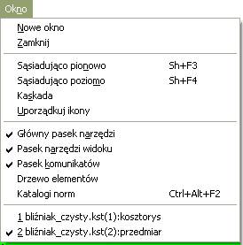 Jak widzimy na Rys. 1., menu jest podzielone na cztery części. Pierwsza grupa zawiera hasła służące do zarządzania powstawaniem i likwidacją poszczególnych okien. Okna mogą zawierać różne widoki tego samego kosztorysu lub różne, wczytane do programu, kosztorysy. Na rysunku pierwszym mamy wczytane dwa widoki jednego kosztorysu o nazwie bliźniak_czysty. Widać to w czwartej, ostatniej sekcji menu.