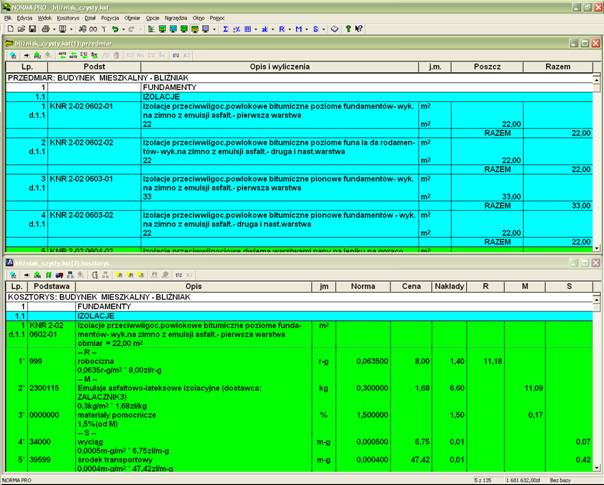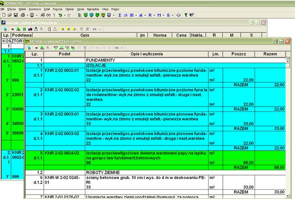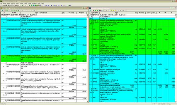 Umieszczenie na ekranie dwóch okien równocześnie daje wiele możliwości. Po pierwsze pozwala na śledzenie większej ilości informacji. Możemy w jednym momencie oglądać kosztorys i przedmiar lub którekolwiek z zestawień, widząc natychmiastowy wpływ każdej zmiany w jednym miejscu na dane w innym. Na przykład w jednym oknie ustawiamy widok kosztorysu, a w drugim widok tabeli elementów scalonych lub podsumowania. Widzimy wówczas od razu jak zmieniają się wartości podsumowania każdego działu przy zmianach poszczególnych elementów kosztorysu. Gdy w oknach mamy różne kosztorysy, to możemy pomiędzy nimi przeciągać pozycje. Mając w jednym oknie widok kosztorysu, a w drugim zestawienie materiałów, możemy wstawiać do pozycji materiały bezpośrednio z zestawienia metodą przeciągania.
