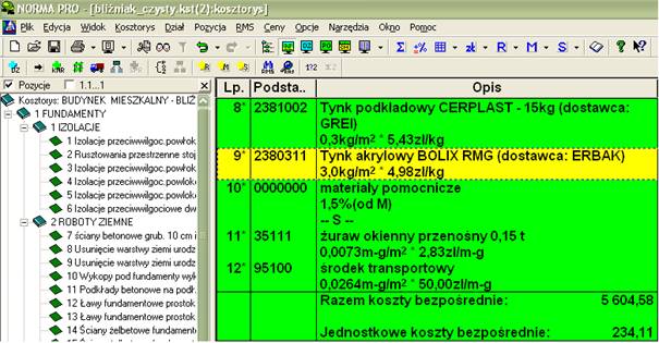 Rys. 10. Widok kosztorysu z drzewem elementów