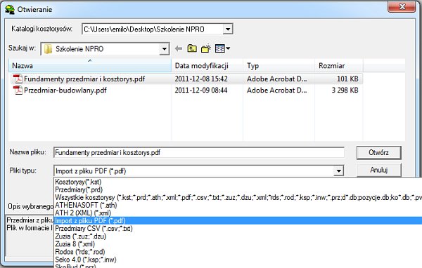 Z górnego menu wybieramy kolejno opcje: Plik i Otwórz. Następnie z listy "Pliki typu" wybieramy pozycję "Import z pliku PDF" i wskazujemy dokument PDF z kosztorysem (przypominam, że moduł PDF nie odczytuje danych z zeskanowanych wydruków papierowych).