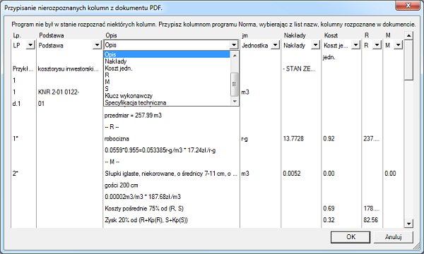 Przy wczytywaniu pliku PDF może pojawić się okno "Przypisanie nierozpoznanych kolumn z dokumentu PDF", w którym należy sprawdzić i ewentualnie poprawić powiązanie kolumn. W większości przypadków rozpoznanie odbywa się automatycznie i nie wymaga ingerencji użytkownika.