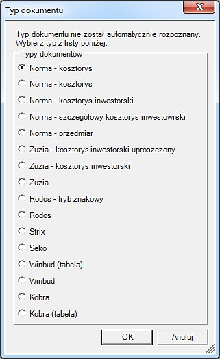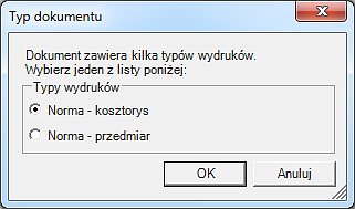 - gdy wczytywany dokument zawiera kilka typów wydruków (np. przedmiar i kosztorys)