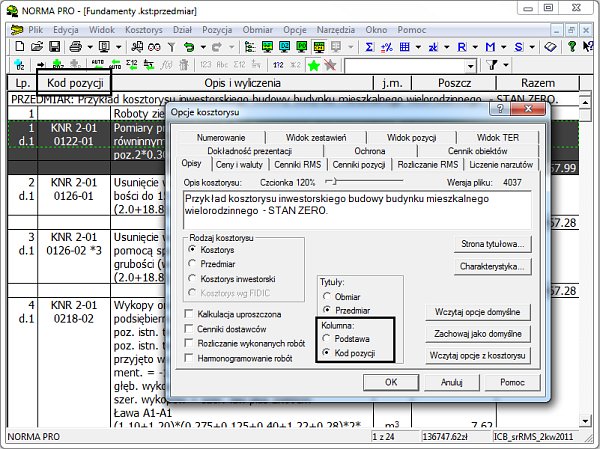 W Normie 4.37, w oknie "Opcje kosztorysu" umożliwiliśmy zmianę opisu kolumny "Podstawa" na "Kod pozycji" (zmiana dotyczy tylko widoku "Przedmiar/Obmiar").