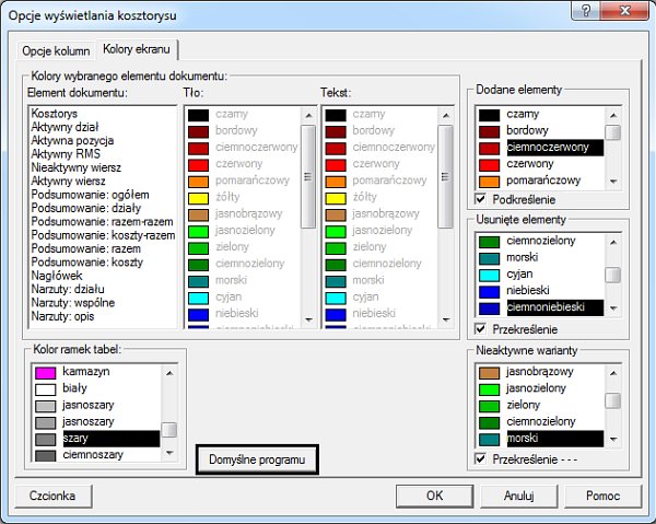 Na prośbę tego samego klienta został dodany przycisk "Domyślne programu" w "Opcjach wyświetlania kosztorysu", na zakładce "Kolory ekranu". Nowa opcja pozwoli szybko przywrócić początkowe ustawienia w Normie PRO i STANDARD po nieudanych próbach zmian kolorystyki.
