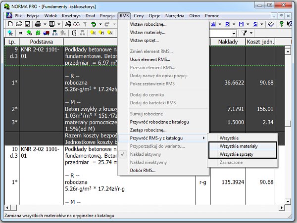 Do tej pory w Normie były dwa polecenia w menu RMS pozwalające przywracać nakłady z bazy katalogów. Jedno dotyczyło, wszystkich RMS-ów - "Przywróć RMS-y z katalogu → Wszystkie", drugie robocizny - "Przywróć robociznę z katalogów". W wersji 4.37 pojawiły się dwa nowe polecenia, pozwalające przywracać tylko materiały lub sprzęty: