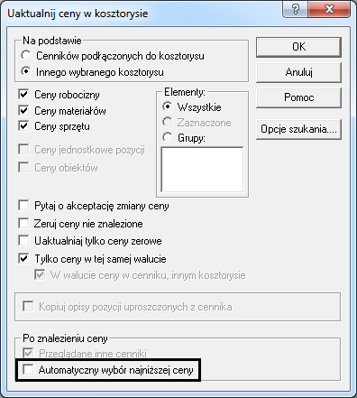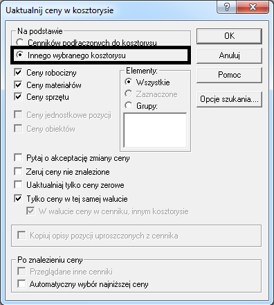 Teraz wystarczy wywołać okno „Uaktualnij ceny w kosztorysie” (menu „Ceny -> Uaktualnij ceny…”), zaznaczyć opcję „Innego wybranego kosztorysu” i kliknąć na przycisku OK.
