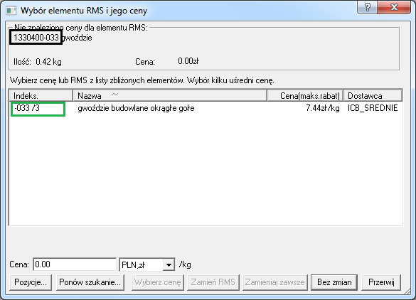 Jeżeli zostanie znaleziony jeden nakład o zgodnym indeksie lub włączona jest opcja „Automatyczny wybór najniższej ceny", program bez pytania pobierze cenę i wstawi ją do kosztorysu.