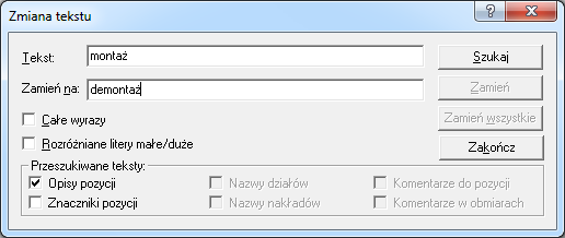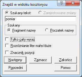 Drugim przydatnym narzędziem jest opcja wyszukiwania tekstu w opisach, którą możemy wywołać używając skrótu - CTRL+F. W pokazanym poniżej okienku można wprowadzić szukaną frazę oraz dodatkowe parametry wyszukiwania.