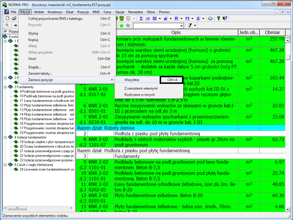 Poniżej widzimy przykład widoku kosztorysu (po zastosowaniu filtra) z pozycjami zawierającymi znaczniki.