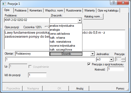 Do pozycji można przypisać jeden z domyślnych znaczników lub własny zdefiniowany wcześniej w słowniku. Edycję znaczników można wywołać z poziomu każdego okna pozycji, wystarczy rozwinąć listę znaczników i wybrać „Słownik”.