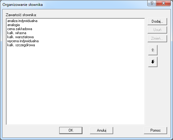 W oknie „Organizowanie słownika” można edytować istniejące znaczniki pozycji lub dodawać własne.