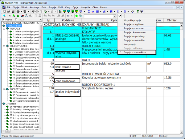 Od wersji 4.36 tak oznaczone pozycje w kosztorysie można wyświetlić dzięki nowemu filtrowi „Pozycje ze znacznikiem”. Jest on dostępny na widokach: