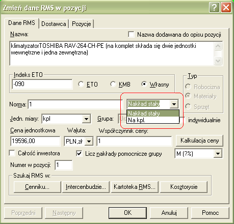 A i tak wartość podana przeze mnie jest jedynie bliższa prawdzie, ale też nie jest idealnie dokładna. Efekt uniezależnienia ilości nakładu od obmiaru można osiągnąć znacznie prościej. Wystarczy określić nakład jako stały wybierając właściwe hasło z rozwijalnej listy widocznej na Rys. 1.