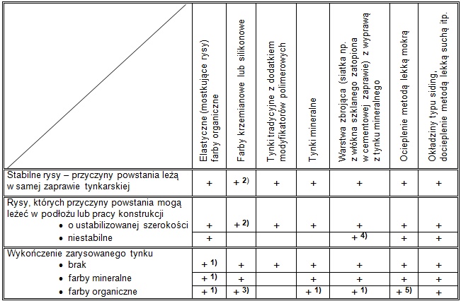 Sama naprawa musi być adekwatna do przyczyn, które spowodowały powstanie zarysowań. Przy możliwości zmiany szerokości rozwarcia rys niezbędna będzie zdolność do ich mostkowania. Przy rysach stabilnych rozwiązaniem może być zastosowanie farb elewacyjnych o właściwościach hydrofobowych lub połączonych z zabiegiem hydrofobizacji podłoża. Oczywiście istotne jest, czy naprawa ma dotyczyć pojedynczych rys, czy np. całej powierzchni zarysowanego tynku. Tabelaryczne zestawienie przykładowych sposobów naprawy tynku lub sposobu ochrony elewacji wg [3] podano poniżej: