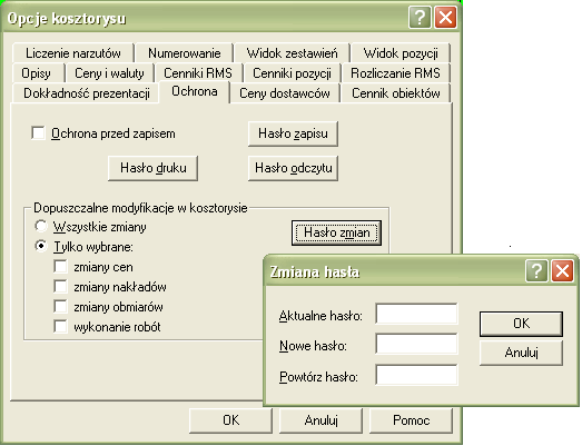 Rys. 1. Okno opcji kosztorysu z oknem zmiany hasła