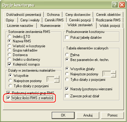 Tu muszę się Państwu przyznać do pewnego, drobnego oszustwa. To znaczy - nie my oszukujemy. My tylko dajemy Państwu możliwość oszukiwania. Wywołując opcje kosztorysu i wybierając zakładkę Widok zestawień możemy zaznaczyć opcję Wylicz ilości RMS z wartości, która spowoduje, że ilość wykazywana w zestawieniu nie jest sumą nakładu ze wszystkich pozycji, w których on występuje, lecz jest wyliczana przez podzielenie wartości przez cenę.