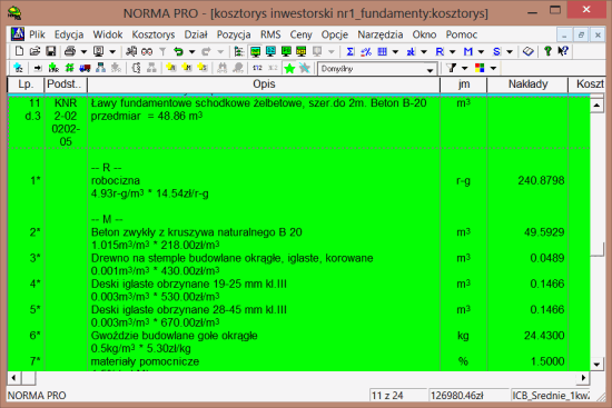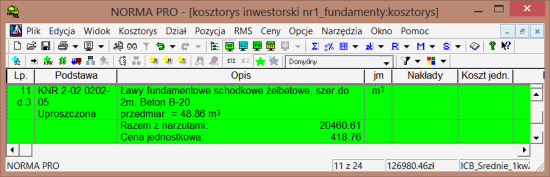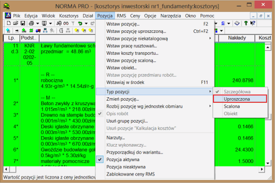 Zacznijmy od pierwszego sposobu. Rysunek poniżej przedstawia przykładowy kosztorys z wybraną pozycją nr 11 „Ławy fundamentowe…” (tło aktywnej pozycji, w przypadku opcji domyślnych, zmienia się na zielone). Teraz z menu Pozycja wybieramy kolejno: Typ pozycji -> Uproszczona.