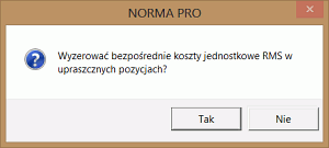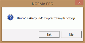 Program wyświetli dwa pytania. Pierwsze dotyczy usunięcia nakładów RMS z upraszczanej pozycji - wybieramy TAK.