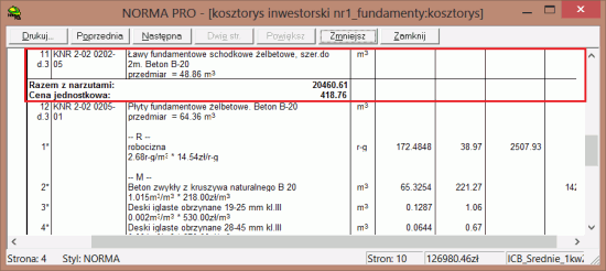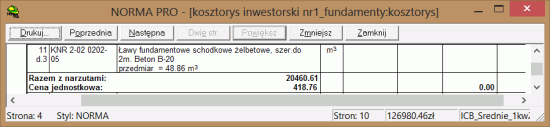 Przedstawiona przed chwilą metoda może być kłopotliwa w przypadku kiedy zajdzie potrzeba zmiany ceny w jednym z nakładów uproszczonej pozycji. Niestety usunęliśmy je, więc teraz należałoby przywrócić RMS’y z bazy, zmodyfikować cenę nakładu i... ponownie uprościć pozycję przed wydrukowaniem kosztorysu. To komplikuje i niepotrzebnie wydłuża pracę, dlatego też w Normie 4.41 wprowadziliśmy nową opcję - Drukuj jak uproszczoną. Jest ona dostępna w oknie, które można wywołać klikając dwukrotnie na podstawie wybranej pozycji.